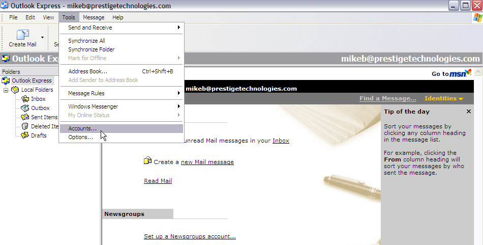 Enter your email as you normally would. Choose Tools from the top menu bar the choose Accounts as shown in figure 1.