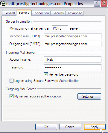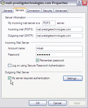 Due to many requests we have changed settings on our email servers to accommodate the needs of our clients and protect them from fraudulent emails. In order to apply these settings on our server without effecting your mail you must apply "smtp authentication" settings to your POP account. Here are the outlook settings since this is our most popular email client.