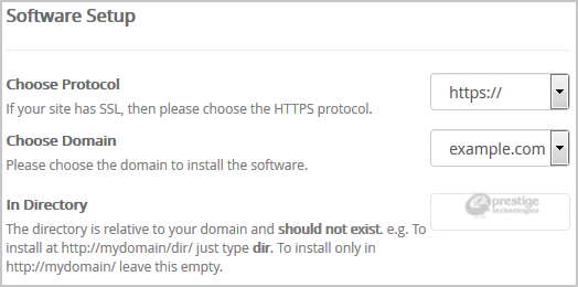 • In Directory: If you want to install this in a directory, for example example.com/directory, enter the directory name. Otherwise, leave this blank to install in your main domain example.com
