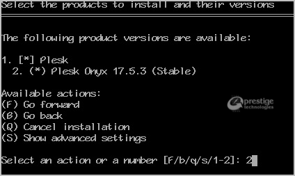 Step 2: Now you can select a version. For Plesk, type 1 and for Plesk Onyx, type 2. Then press enter. Type "F" and press enter again to go to the next option.