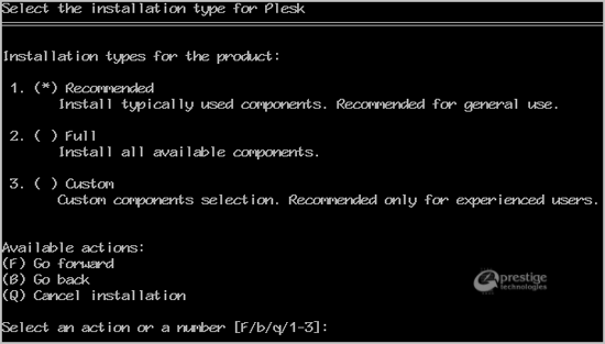 Step 3: In "Select the Installation type for Plesk" enter "F" or, in case you are familiar with what you are doing, chose the other option - installing all components by entering "2" (without the quotes) and press "F'.
