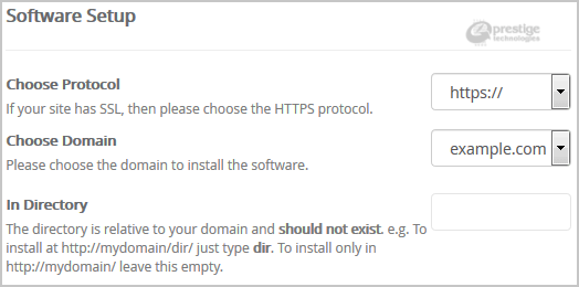 • In Directory: If you want to install this in a directory, for example example.com/directory, enter the directory name. Otherwise, leave this blank to install in your main domain example.com