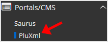 4. On the left side of your screen you should locate the "Portal/CMS" category. Click on it and then click on the "PluXml" link that will appear.