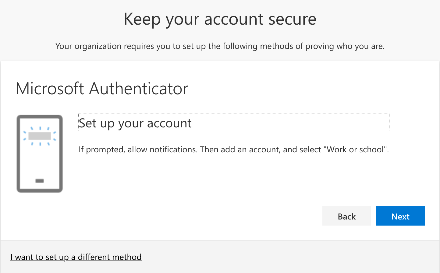Once you click Next you will be presented with a screen to start setting up your Microsoft Authenticator App. At this time you will need to download the Microsoft Authenticator App to your mobile device.