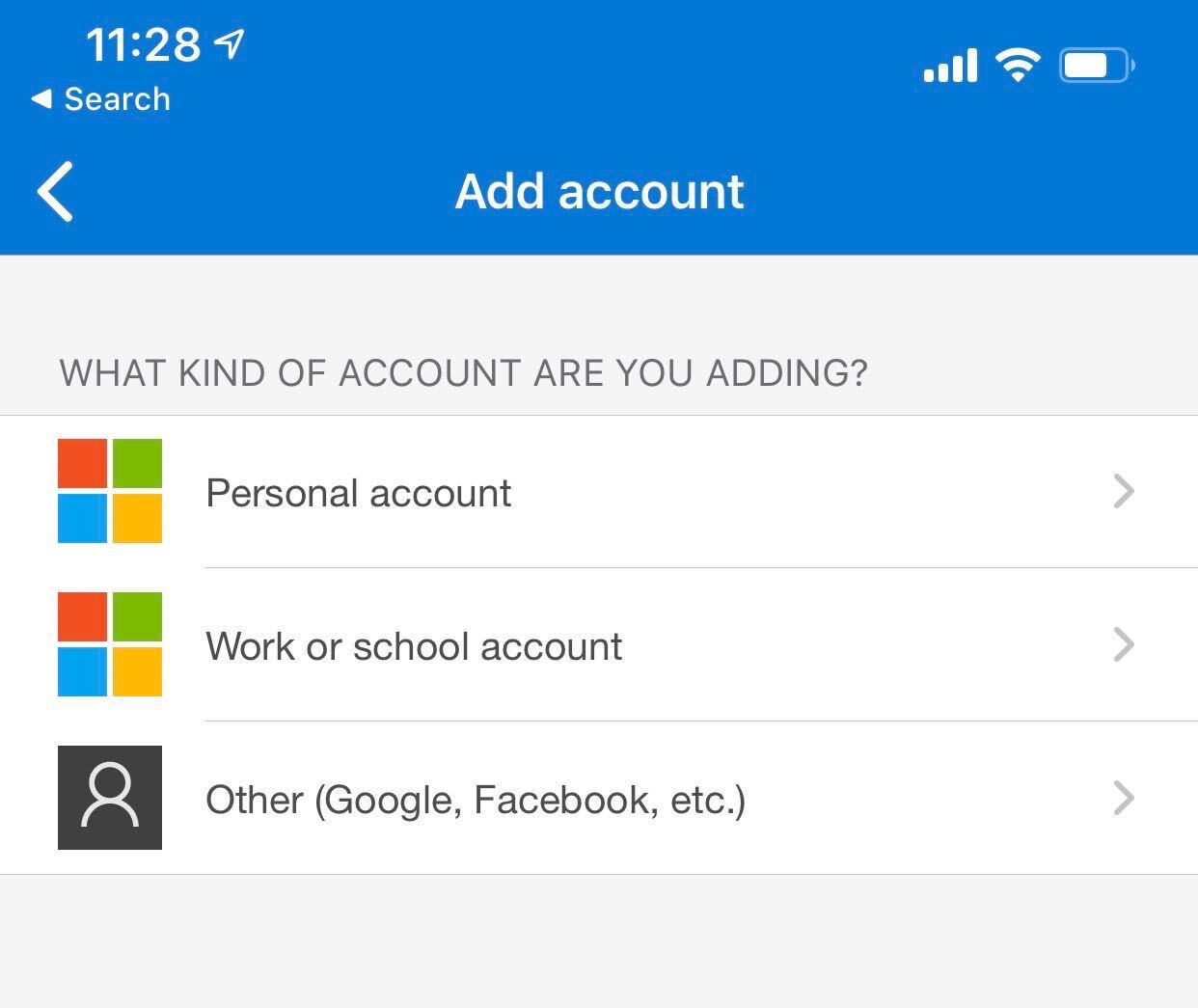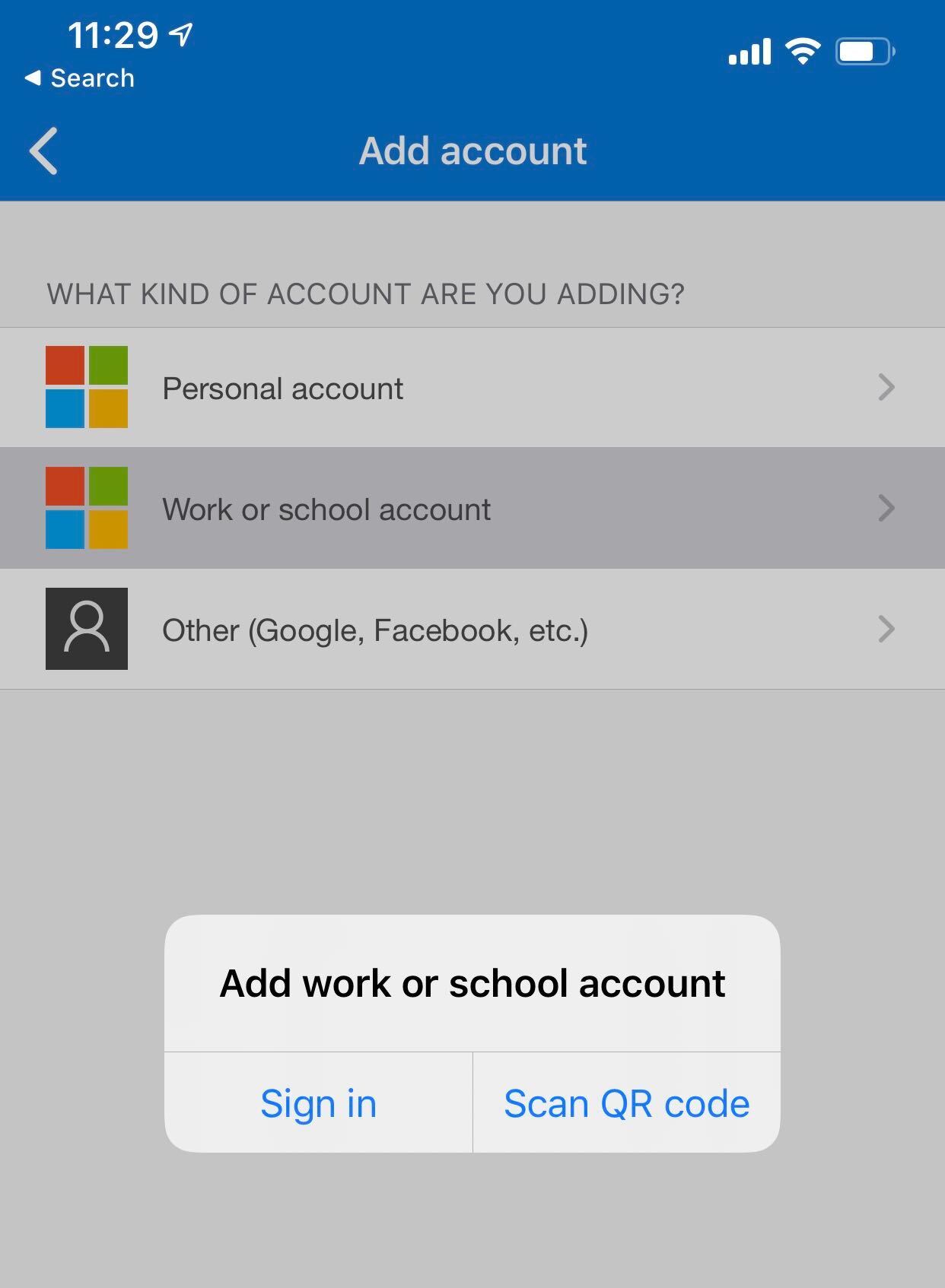 Once in the app you can click the + to add an account, and then here you can choose Work or School account.
