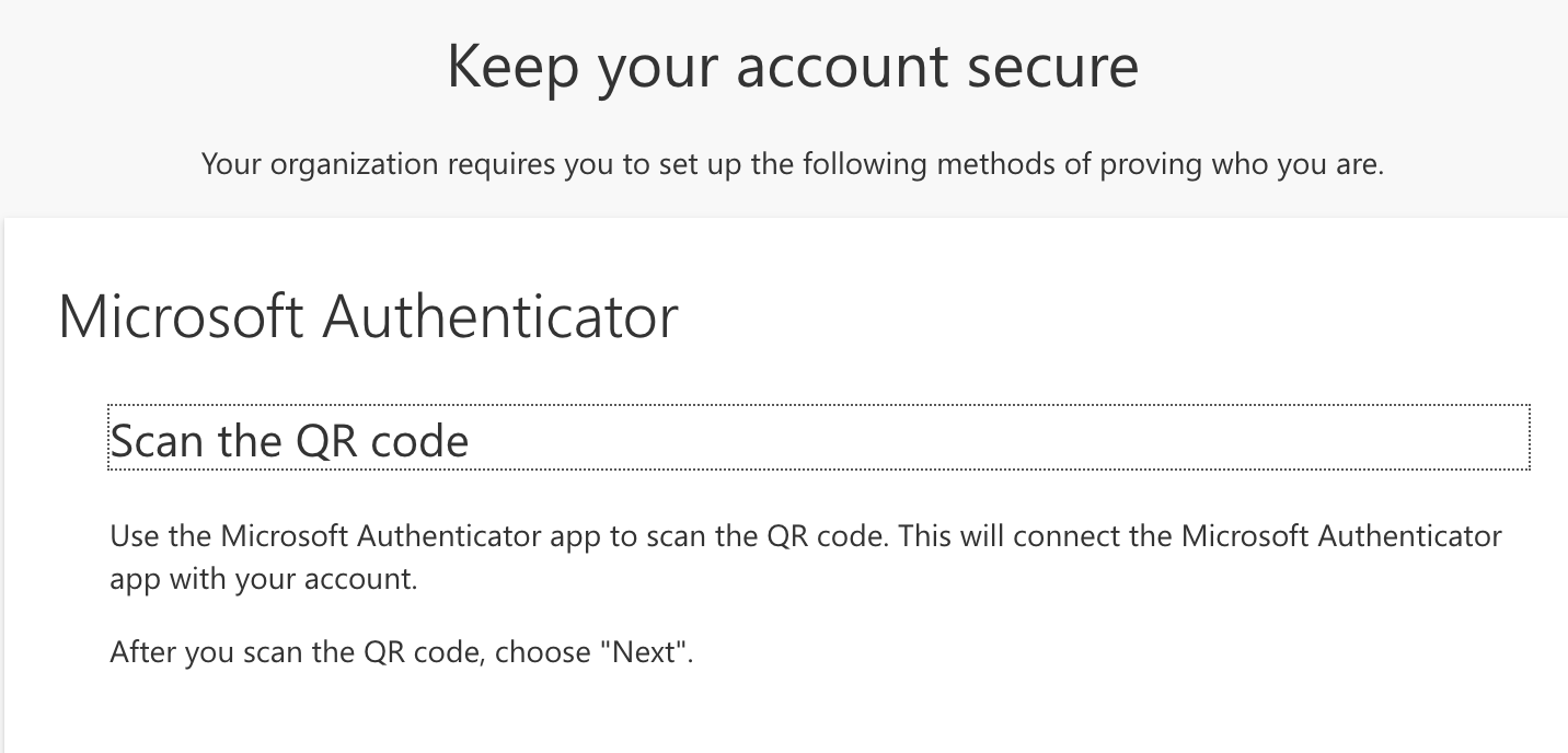 Next you will see a screen and with a QR Code. For security of this help article we are not displaying the QR Code but in your screen you will see one. Once you are on this screen you will want to open the Microsoft Authenticator App on your phone.